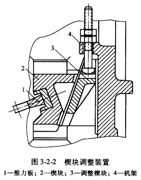 (2)楔塊調(diào)整。借助后推力板支座與機架后壁之間的兩個楔塊的相對移動來實現(xiàn)破碎機排礦口的調(diào)整(圖3-2-2)。轉(zhuǎn)動螺栓上的螺帽,使調(diào)整楔塊3沿著機架4的后壁做上升或下降移動,帶動前楔塊2向前或向后移動;從而推動報力板或動領(lǐng),以達到排礦口調(diào)整的目的。此法可以達到無級調(diào)整,調(diào)整方便,節(jié)省時間,不必停車調(diào)整,但增加了機器的尺寸和質(zhì)量。中、小型額式破碎機常常采用這種調(diào)整裝置。