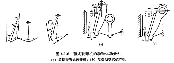 顎式破碎機(jī)動(dòng)顎運(yùn)動(dòng)的軌跡見圖3-2-6。在簡(jiǎn)擺型顎式破碎機(jī)中,動(dòng)顎以中心軸為中心而擺動(dòng)一段圓弧,其下端的擺動(dòng)行程較大,上端較小。擺動(dòng)行程可分為水平的與垂直的兩個(gè)分量,視結(jié)構(gòu)的幾何關(guān)系而定,其比例大致如圖3-2-6a所示。復(fù)擺型顎式破碎機(jī)的運(yùn)動(dòng)軌跡較為復(fù)雜,動(dòng)領(lǐng)上端的運(yùn)動(dòng)軌跡近似為圓形,下端的運(yùn)動(dòng)軌跡近似為橢圓形。其行程的水平與垂直分量的比例大致如圖3-2-6b所示。簡(jiǎn)擺型與復(fù)擺型領(lǐng)式破碎機(jī)動(dòng)領(lǐng)運(yùn)動(dòng)的另一個(gè)區(qū)別,就是在簡(jiǎn)擺型中,動(dòng)顎上端均下端同時(shí)靠近固定顎或遠(yuǎn)離固定顎,即動(dòng)顎上端與下端的運(yùn)動(dòng)是同步的;而在復(fù)擺型中,動(dòng)顎上端與下端的運(yùn)動(dòng)是異步的,例如,當(dāng)動(dòng)顎上端朝向固定顎運(yùn)動(dòng),下端卻向相反于固定顎的力向運(yùn)動(dòng)。換句話說,在某些時(shí)刻,動(dòng)顎上端正在破碎物料,下端卻正在排出物料,或反之。