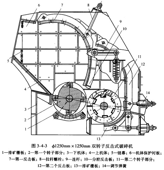 由反擊式破碎機的結構圖可知,轉子、板錘和反擊板是構成反擊式破碎機的主體,直接影響著反擊式破碎機的整體性能。