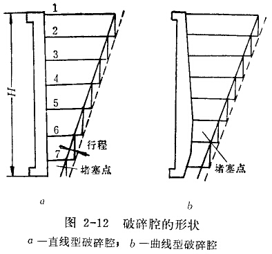 破碎腔的形狀有直線型和曲線型兩種。若兩種破碎腔的給礦口寬度、排礦口寬度、動顎的擺動行程和擺動次數(shù)均相同時,礦石在破碎腔內(nèi)的流動狀態(tài)如圖2-12所示。圖中實線表示顎板閉合時的位置,虛線表示顎板后退最遠時的位置。