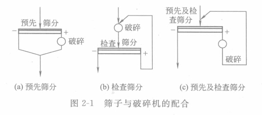 當(dāng)篩分作業(yè)和破碎作業(yè)配合進(jìn)行時稱為輔助篩分。省用在破碎前把合格粒級預(yù)先篩山叫預(yù)先篩分;若用在破碎后以控制破種產(chǎn)品的粒度則叫檢查篩分。預(yù)先篩分的日的是為了避免物料的過粉碎,從而提高破砷設(shè)備的生產(chǎn)能力和減少動力消耗。檢查篩分的日的是從破碎設(shè)備的產(chǎn)物小將粒度不合格的大塊篩出,以保認(rèn)產(chǎn)品小超過獎求的粒度上限,如圖2—1所示。