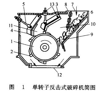 單轉(zhuǎn)子反擊式破碎機結(jié)構見圖l。物料內(nèi)進料口7下到破碎機體6內(nèi)。為了防止破碎后的料塊從進料口飛出,在進料口處裝有一排鏈條8。給入的料塊落到算條篩9上。細小的碎塊經(jīng)篩下直送排料口12,大塊的物料順算條落到轉(zhuǎn)于1上。轉(zhuǎn)子軸上面裝有凸起一定高度的板錘2。板錘根據(jù)轉(zhuǎn)子直徑大小有4—6排。轉(zhuǎn)子由電動機經(jīng)過聯(lián)軸器和軸帶動轉(zhuǎn)子轉(zhuǎn)動。料塊就在高速旋轉(zhuǎn)的板錘和反擊板3之間來回碰撞破碎,在箅條篩、轉(zhuǎn)子l,第一反擊板3及進料口鏈條組成的空間內(nèi)形成強烈的沖擊區(qū)10,物料破碎后又落到反擊板3和反擊板4以及轉(zhuǎn)子1所組成的第二沖擊區(qū)11內(nèi)近一步受到?jīng)_擊粉碎。破碎后物料經(jīng)轉(zhuǎn)子下方排料口12排出。