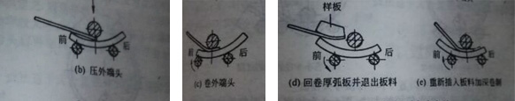 3、按箭頭方向回卷兩板,使厚弧板偏心放置(前多后少),預(yù)彎頭板脫床,并用樣板檢查曲率,若弧欠時可再次插入卷制,直至達到理想弧。(如圖d e)