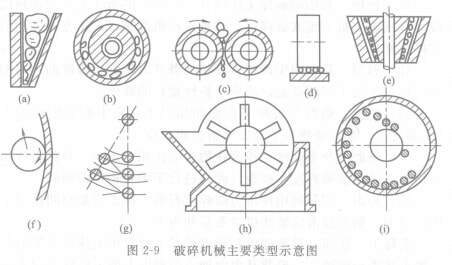 (2)根據(jù)破碎方式、機(jī)械的構(gòu)造特征(動(dòng)作原理)來(lái)劃分,將破碎機(jī)械大體分為六類,如圖2-9所示。