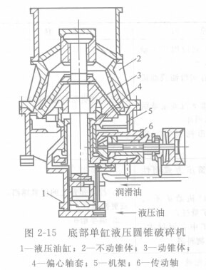 圖2-15為底部單缸液壓圓錐破碎機(jī)構(gòu)造圖。可動(dòng)錐體3的主軸下端插入偏心軸 套4中,并支撐在油缸活塞上面的球面圓盤(pán)上,活塞下面通入高壓油用于支撐活塞。由于偏心軸套的轉(zhuǎn)動(dòng),從而使動(dòng)錐體作錐面運(yùn)動(dòng)。