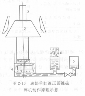 底部單缸液壓圓錐破碎機(jī)動(dòng)作原理如圖2-16所示。