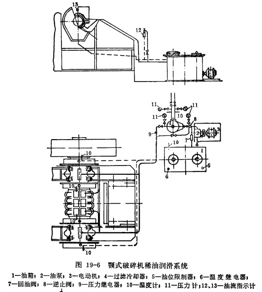 大型破碎機的干油潤滑也必須在一定壓力下進行,干油潤滑系統(tǒng)見圖19—7。干油從干油潤滑裝置獲得壓力后,通過油管分別進入動顎軸承和推力扳支承的潤滑點進行潤滑。每班注油4—6次,每次3分鐘左右。