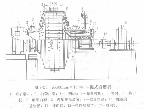 圖2-26為φ5500mm×1800mm濕式自磨機(jī)構(gòu)造示意圖。