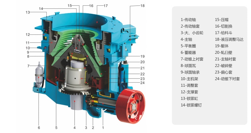 液壓馬達(dá)驅(qū)動調(diào)整套(定錐襯板),可對排料口進(jìn)行準(zhǔn)確調(diào)整,使給料穩(wěn)定,襯板利用率高、產(chǎn)品粒型好。液壓馬達(dá)還可使調(diào)整套和定錐襯板全部轉(zhuǎn)出支撐套,以便更換定錐襯板和動錐襯板,從而大大簡化了襯板更換的工作量。