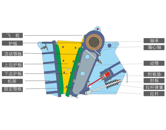 顎板可以根據(jù)破碎物料的不同選擇不同的牙型,使破碎效果更好,為了提高顎板的耐磨性,動顎上方安裝了重型護板,避免因物料沖擊,有效保護動顎體及其內(nèi)部軸承不受損壞。